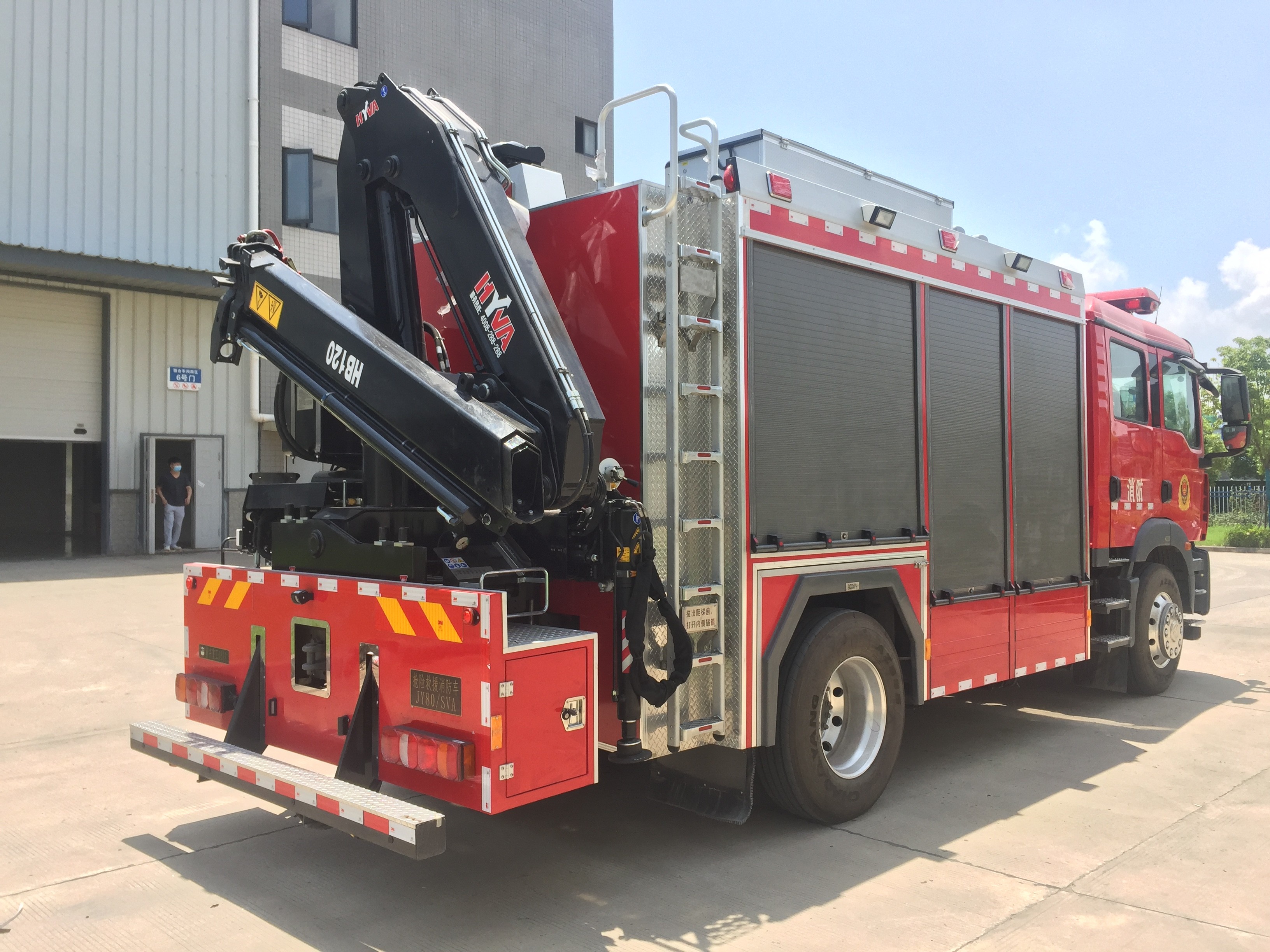 El camión de bomberos de rescate de emergencia JY80 está equipado con el cabrestante eléctrico N16800XF original del campeón de EE. UU.;adopta el generador Honda SHT11500;el techo está equipado con un sistema de iluminación de elevación YZH4-5.04CA;y la parte trasera está equipada con un camión grúa hidráulico SQ5ZK2 producido por XCMG.El compartimiento del equipo adopta la estructura de rotación y tracción, que tiene un alto grado de integración y es conveniente de usar.